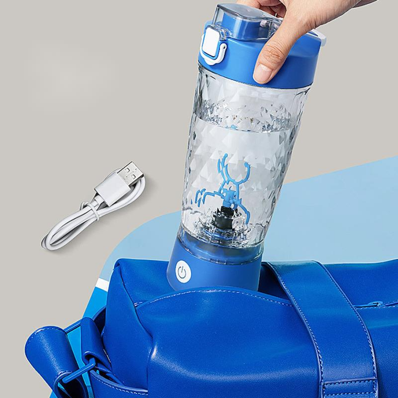 Charge the bottle fully before first use. Fill with your desired beverage or protein mix, then long-press the button to activate the motor for smooth blending. For cleaning, fill the bottle with water and detergent, press the button, and let the shaker self-clean.