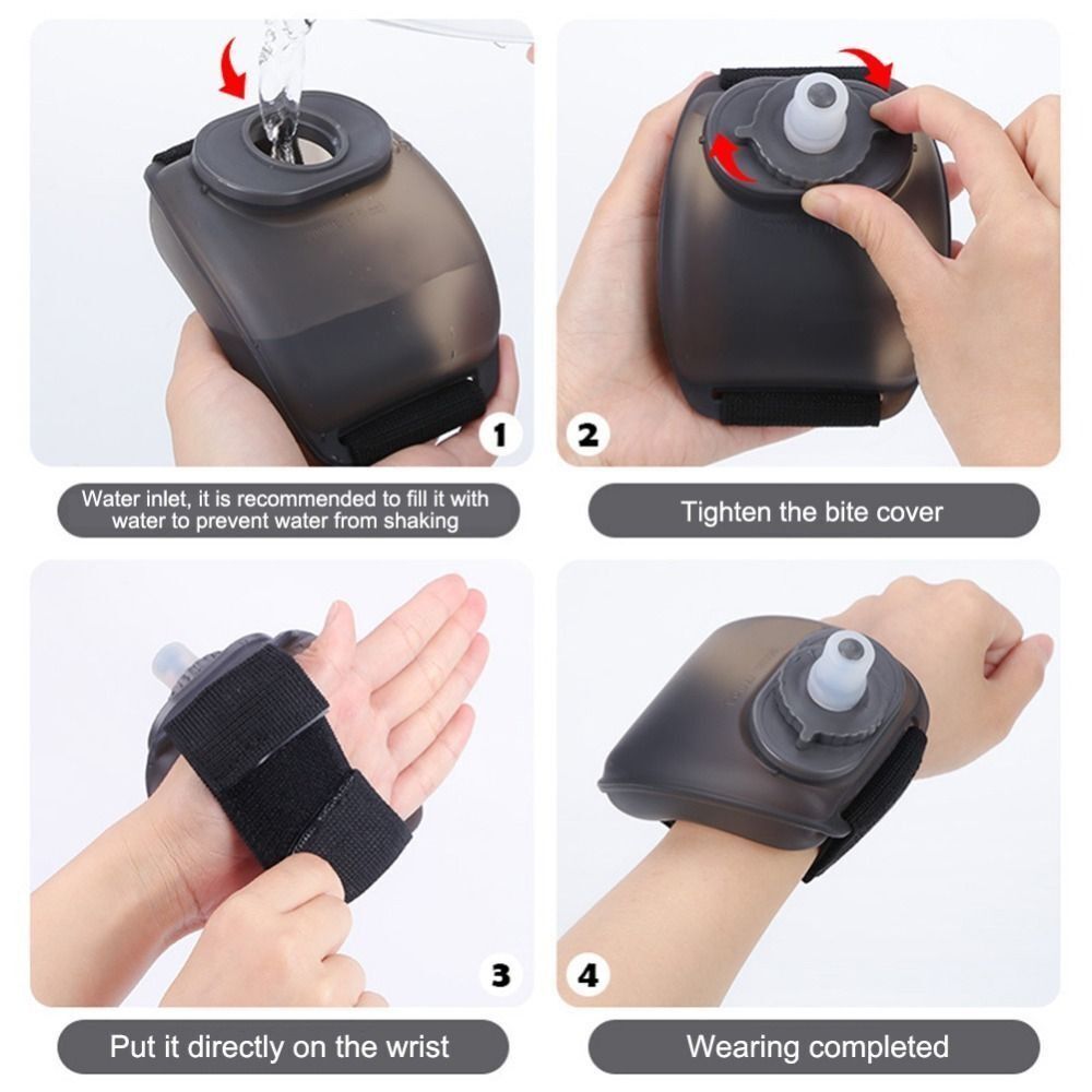Slide the soft flask onto your wrist using the adjustable strap, and drink directly from the nozzle during activity. Hand-wash after use for best longevity.