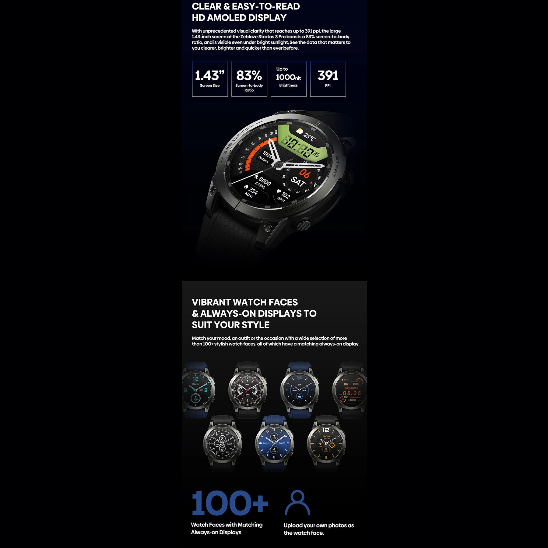 • Display: 1.43” HD AMOLED display with 391 ppi, offering crisp, vivid visuals and excellent readability even under bright sunlight.